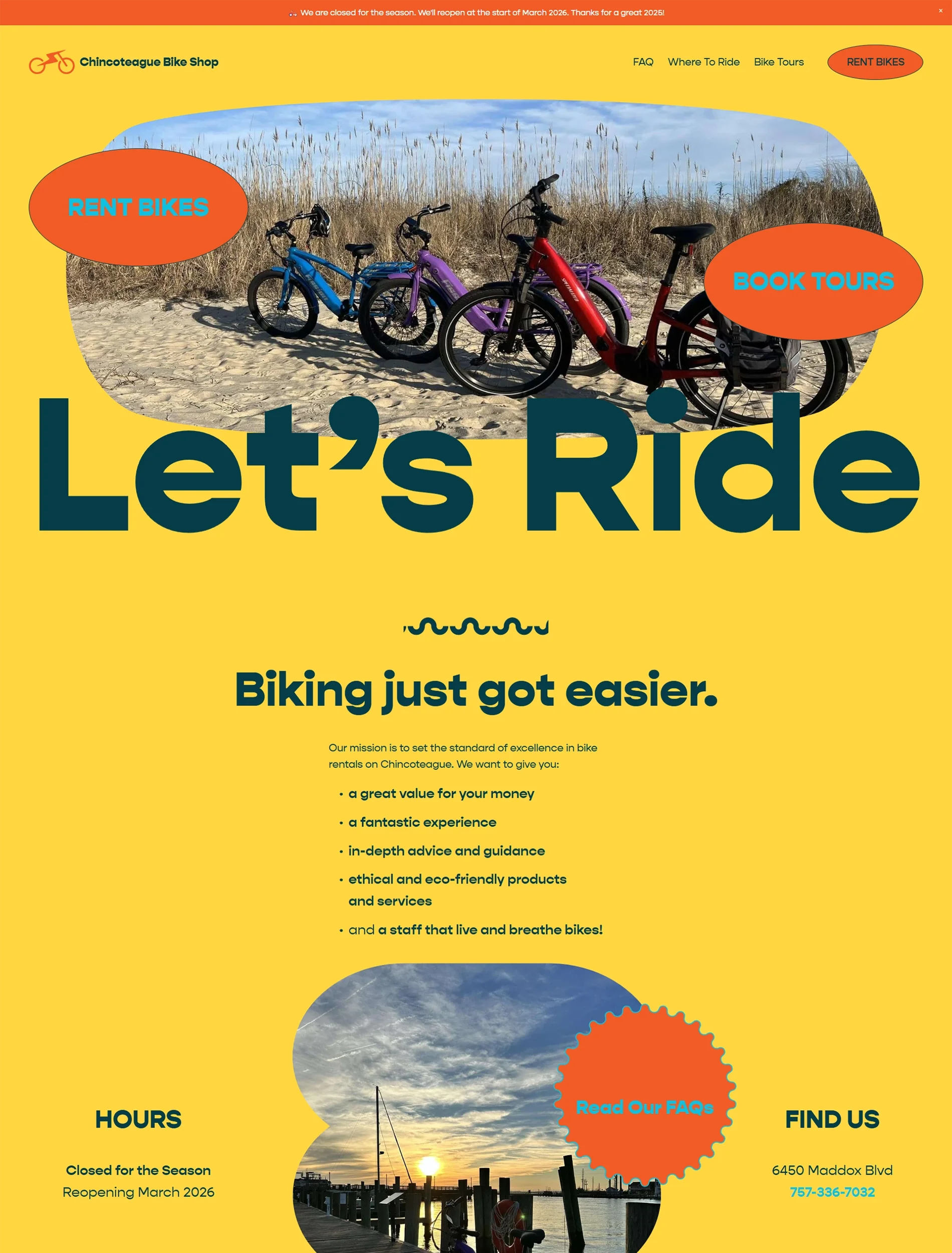 Chincoteague Bike Shop was already a favorite on the island, but their web presence did not match the way visitors actually plan a trip. People were looking for e-bikes, cruisers, routes, pricing, and hours on their phones, yet the old setup made it hard to see what was available and how to book.