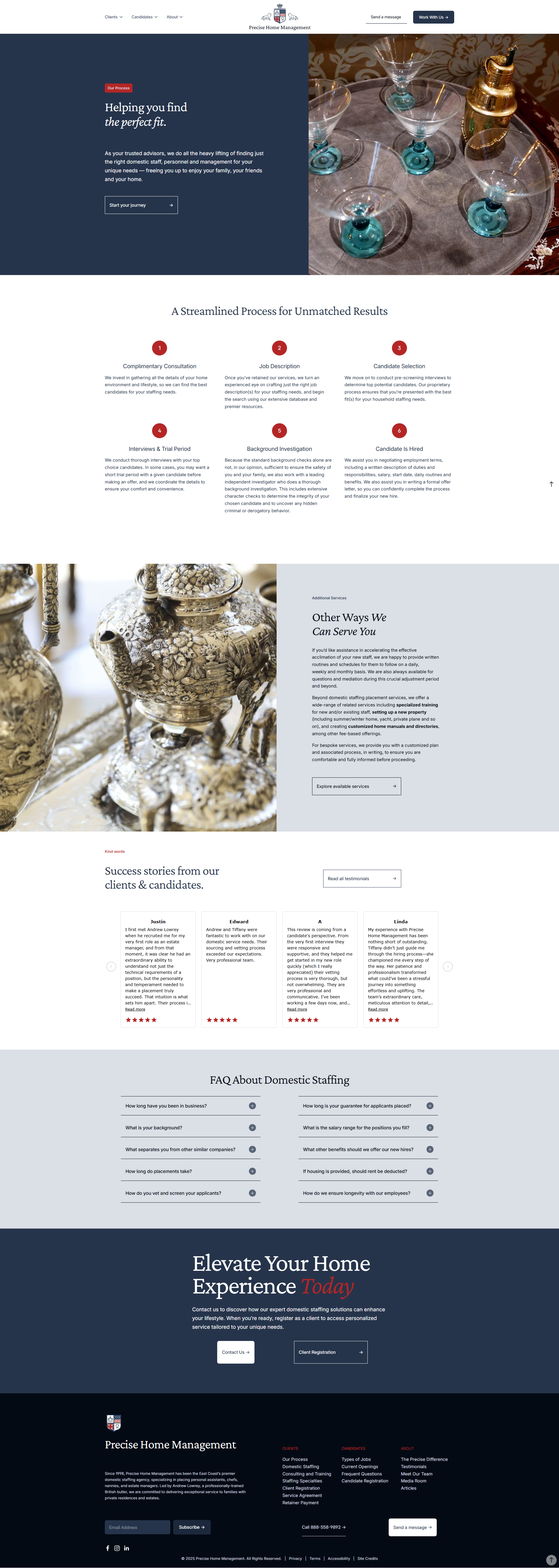 Precise Home Management serves UHNW families who expect absolute discretion, impeccable standards, and long term relationships with their staff. Their old site was crude, with bad photos and generic, distant language that did not reflect the level of private service they provide.