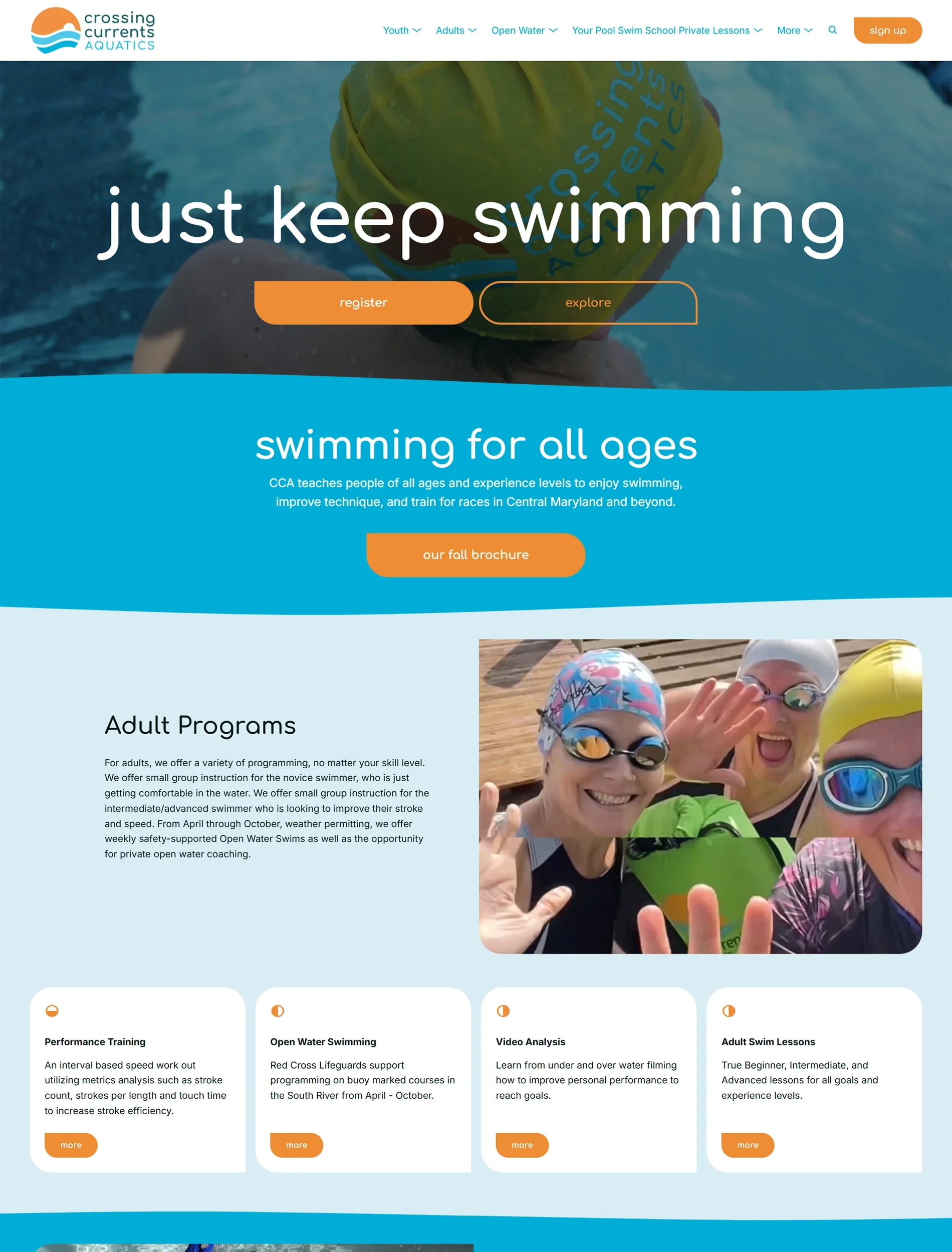 Crossing Currents Aquatics runs a wide range of programs for kids, adults, racers, and open water swimmers, but the old site did not clearly organize them. Visitors had to dig to figure out what was offered for their skill level and where to start.